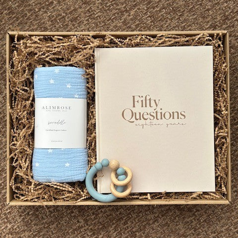 15 Organic Disposable Nappies1 Alimrose Super Soft Organic Cotton Wrap - 120 x 1201 50 Questions Baby Keepsake Journal1 Alimrose Beechwood Teether